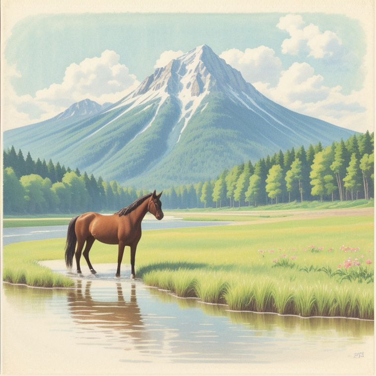 提示词:一匹小河边的马,油画,Alfred J. Casson 风格,山背景,鲜花,富有色彩的,精美细节,