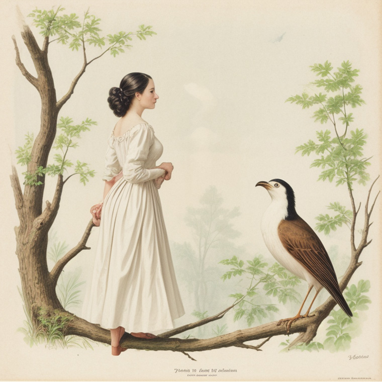 提示词:一个女人,油画,John James Audubon 风格,树林背景,鸟,富有色彩的,精美细节,
