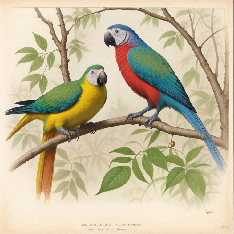提示词:鹦鹉,油画,John James Audubon 风格,树林背景,富有色彩的,精美细节,