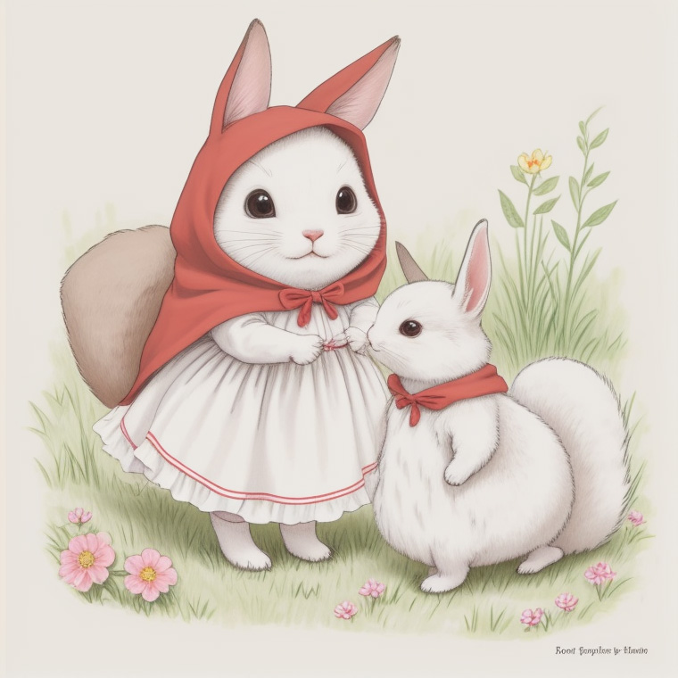 提示词:小红帽和小兔子,Beatrix Potter 风格,精美细节,富有色彩,