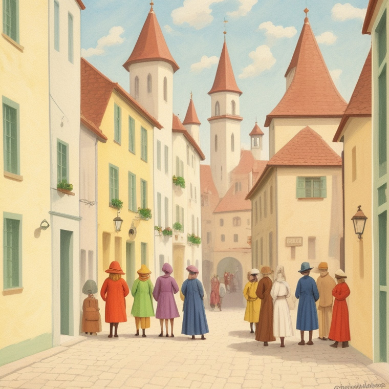 提示词:城市街道,水粉画,Ludwig Bemelmans 风格,中世纪,街道,富有色彩的,精美细节,
