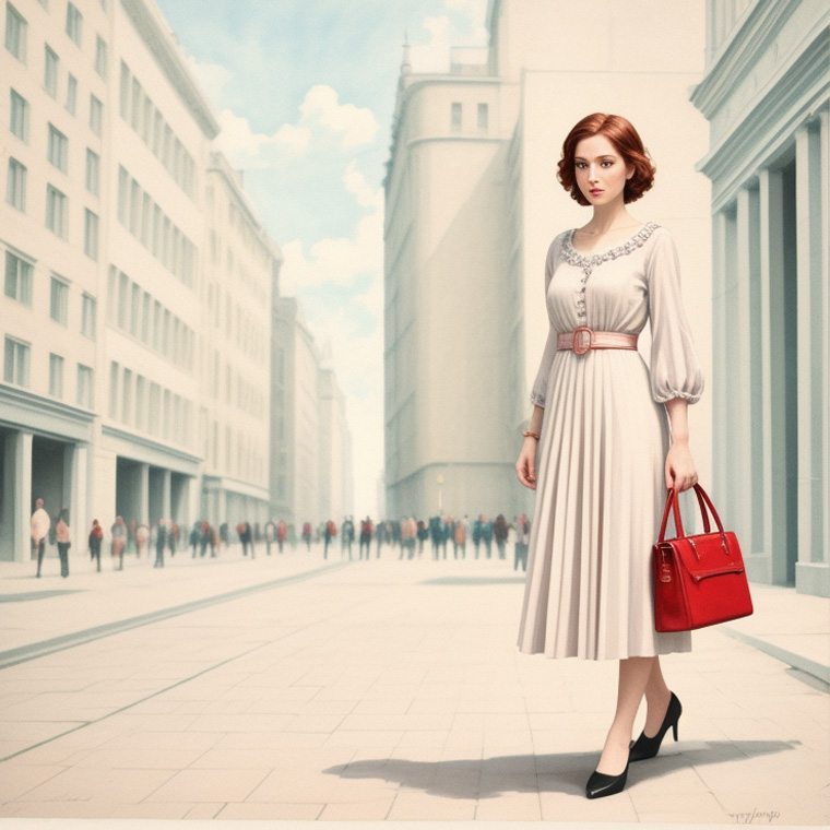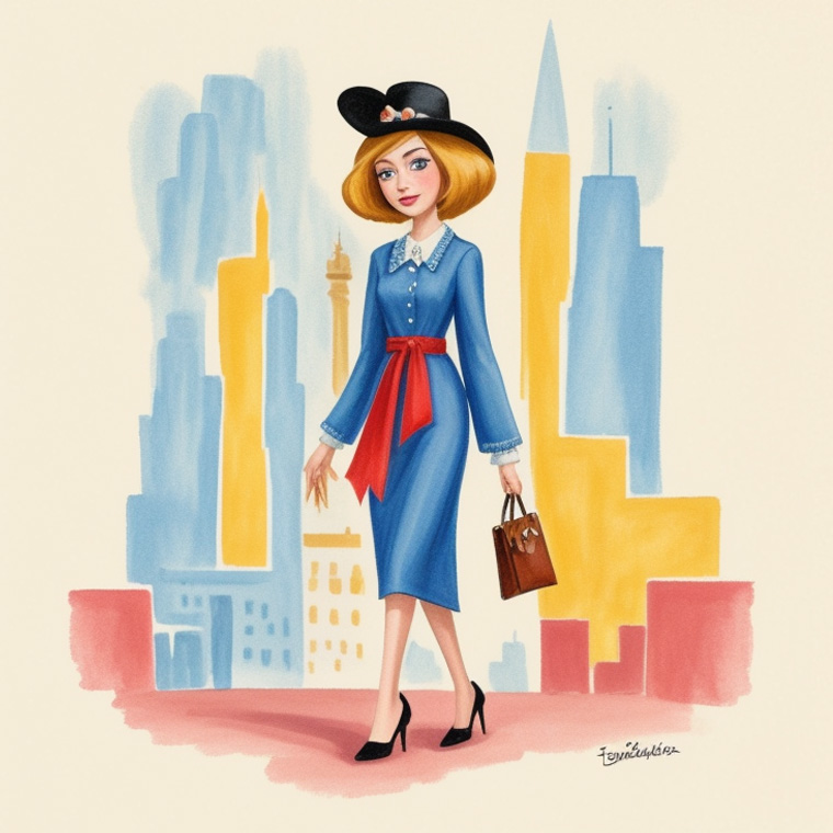 提示词:一个女人,水粉画,Ludwig Bemelmans 风格,现代都市,街道,富有色彩的,精美细节,