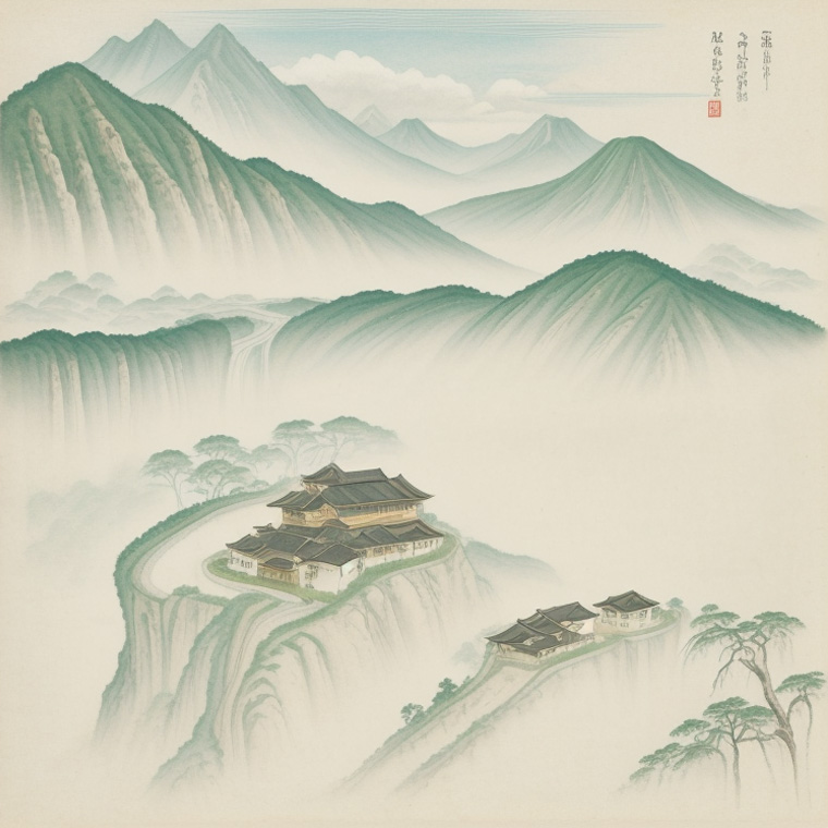 提示词:中国古代山水画,中国画效果,山间高崖飞瀑,曲径通幽,房舍屋宇点缀其间,长松修竹,景色秀丽