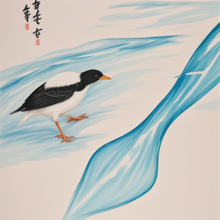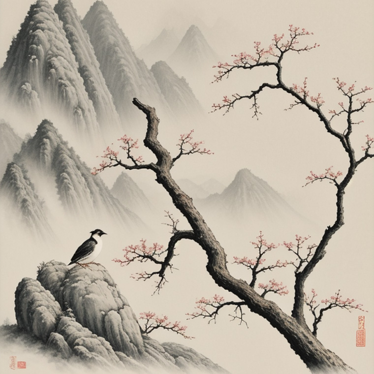 提示词:中国古代山水画,中国画效果,徐悲鸿风格,一只鸟,精美细节