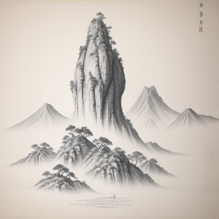提示词:中国水墨山水画,采用散点透视技法,描绘了高耸的山峰,岩石,溪流,森林,高度详细