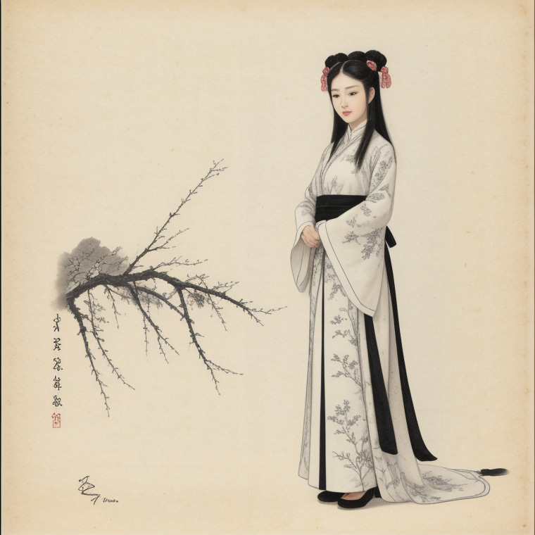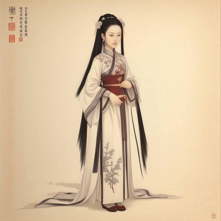 提示词:中国水墨画,仇英风格,中国古代美人,穿着中国服装,全身肖像,展现服饰细节,优雅,聪明,留白,写意濡染