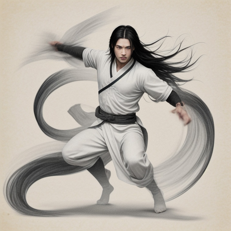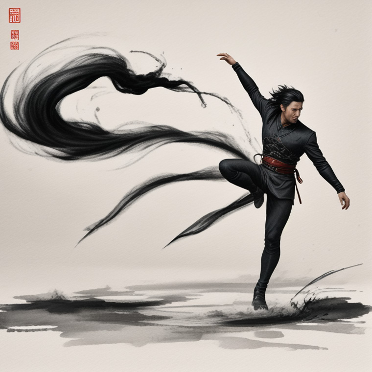 提示词:中国画效果,中国水墨中间,古代中国英俊男子,飘逸的黑发,在战斗中,动态姿态,丰富的背景,柔和的光线,氛围照明,前视图,全身镜头,高细节