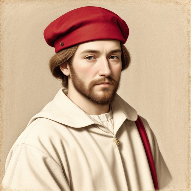 提示词:一个男人,油画,Ambrosius Holbein 风格,肖像,红帽子,锐利的焦点,富有色彩的,精美细节,