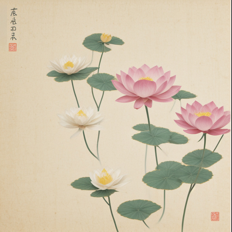 提示词:中国画效果,徐悲鸿风格,荷花,精美细节