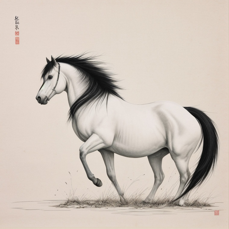 提示词:中国画效果,中国古典画,徐悲鸿风格,水墨泼墨效果,马