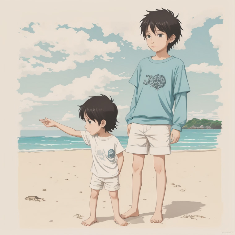 提示词:两个男孩,动漫,Hayao Miyazaki 风格,海边,日本漫画,卡通,2D,富有色彩的,精美细节,