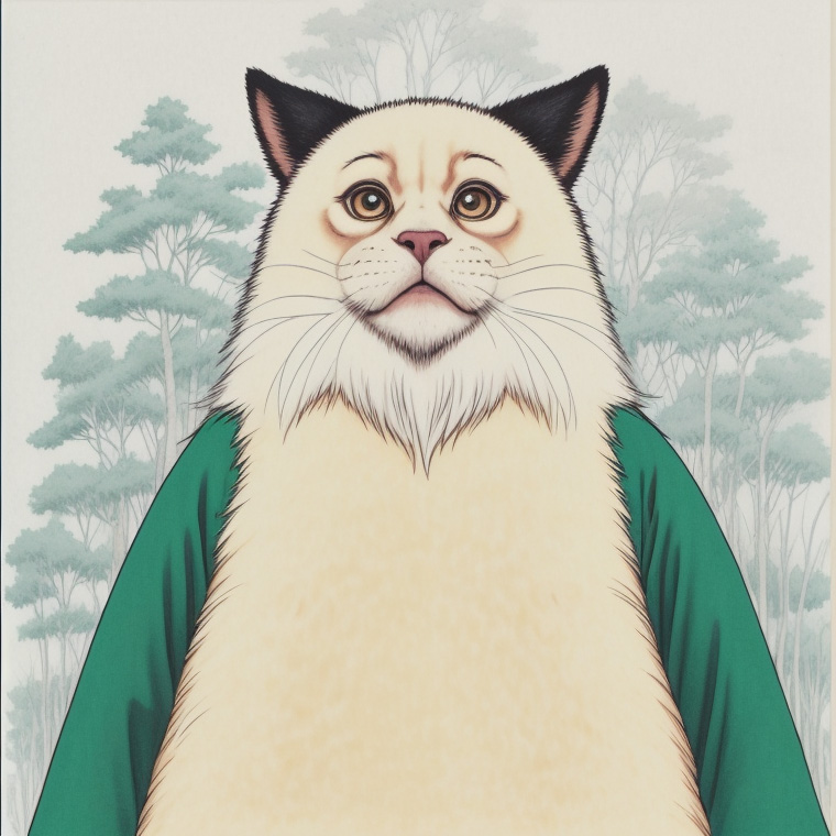 提示词:一只拟人化的猫,动漫,Hayao Miyazaki 风格,森林,漫画,卡通,2D,富有色彩的,精美细节,