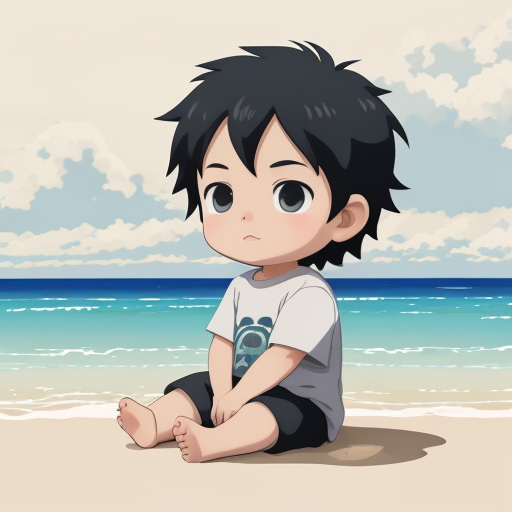 提示词:一个小男孩,坐在沙滩上,动漫,Satoshi Kon 风格,精美细节