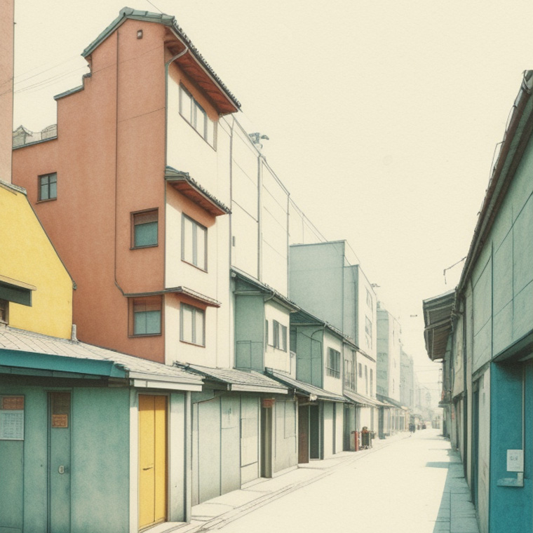 提示词:城市街道,没有人,Hayao Miyazaki 风格,日本漫画,卡通,2D,富有色彩的,精美细节,