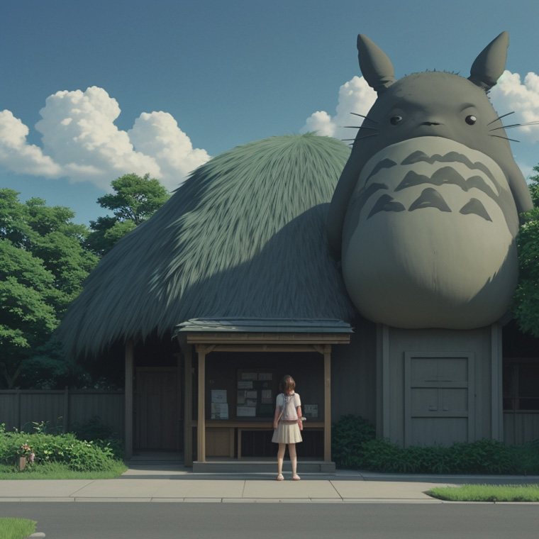提示词:一个女孩和托托罗,托托罗巴士站,吉卜力工作室风格,最好的质量,吉卜力