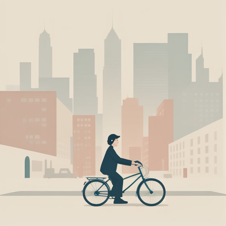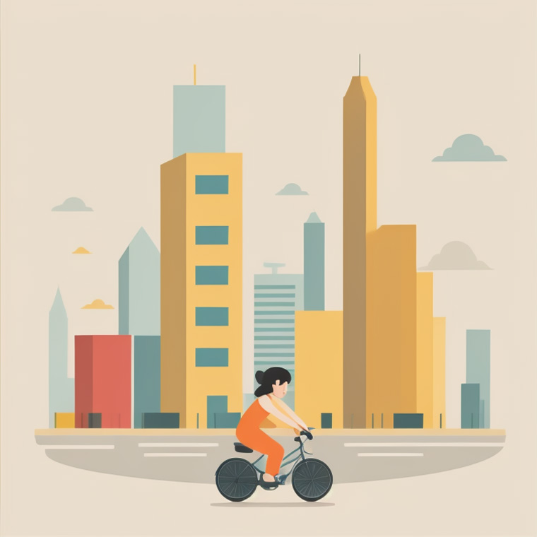 提示词:骑自行车,扁平插画,矢量插画,Jane Newland 的风格,城市街道,富有色彩的,精美细节