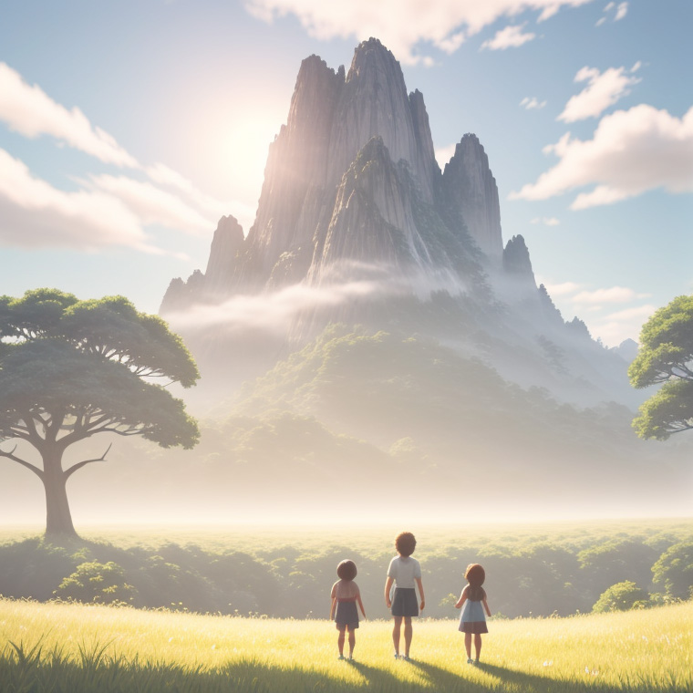 提示词:三个孩子站在山上,绿油油的山林,动漫,卡通插图,吉卜力工作室,皮克斯动画风格,虚幻引擎5,布鲁姆,戏剧性的灯光,日出