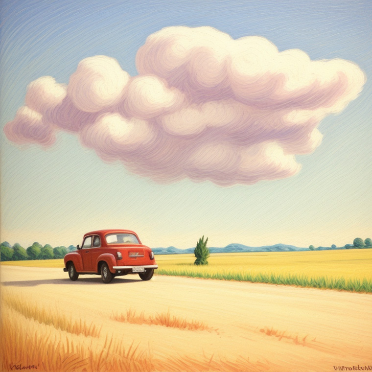 提示词:一辆红色汽车,油画,Vincent Willem van Gogh 风格,田园乡村背景,富有色彩的,精美细节,