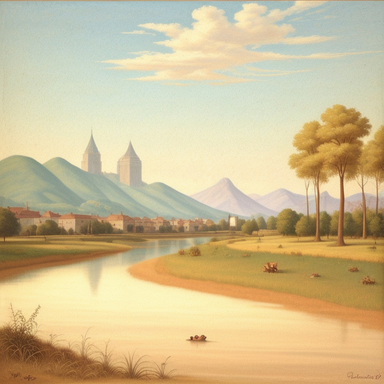 提示词:中世纪都市,油画,Leonardo da Vinci 风格,田园乡村背景,富有色彩的,精美细节,