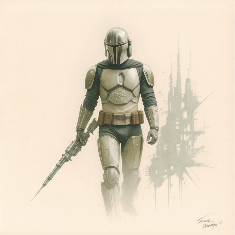 提示词:曼达洛人,John Berkey 风格,科幻,肖像,星球大战,盔甲,美丽的细节